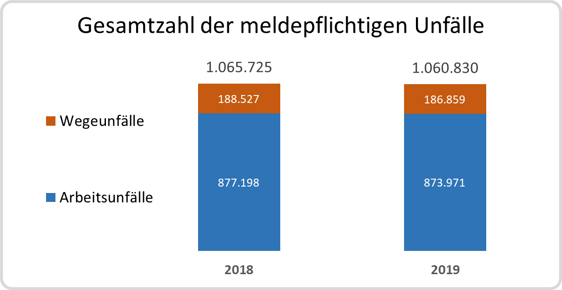 Der Spitzenverband der deutschen gesetzlichen Unfallversicherungen gab für 2018 und 2019 die folgenden Zahlen zu den meldepflichtigen Unfällen bekannt: