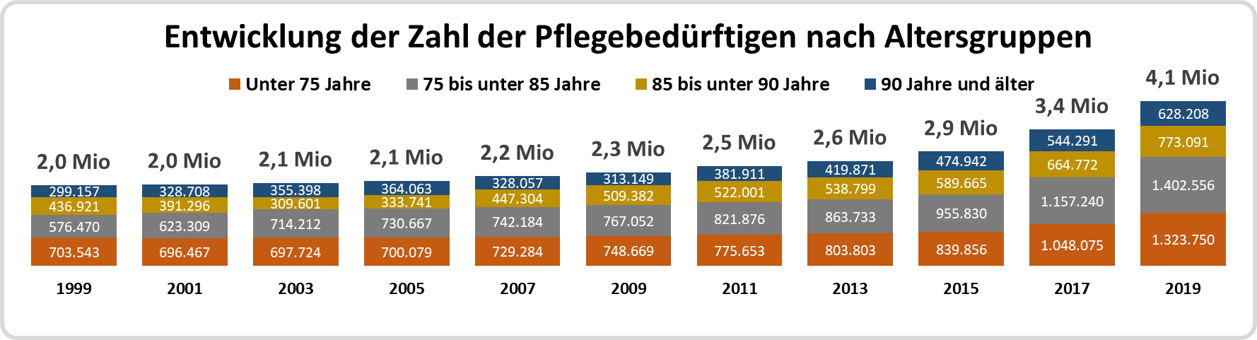 Die Entwicklung der Zahl der pflegebedürftigen Personen nach Altersgruppen ergibt sich aus dem Diagramm.